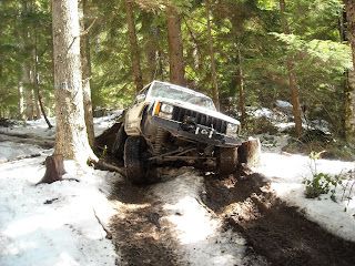 Terry and I left the house around 8:00 and met up with Mike Jennings for breakfast in Eatonville. By the time we were done, Rudi, Karl, Chad, Penny and Tom were only about 15-30 minutes behind us. We arrived at Elbe first and unloaded while we waited for them. As soon as they arrived, we realized no one had the gate code to get into the camping area. Karl had tried to contact Nancy with the DNR earlier in the week to no avail. Chad and Karl drove into Elbe to see if anyone knew the code. We also tried the "there is only 10,000 options, just start and 0-0-0-0 and work up to 9-9-9-9 and we will find it." After meddling with the lock for an hour or so and putting some calls into the DNR and friends, we decided to hit the trail. Terry and I haven't really wheeled Elbe before and weren't too sure as to what to expect as there was still some snow on the ground. We started with our adopted trail first, but with the snow on the ground, we couldn't do any work so decided to wheel on. We didn't have too many issues, but did pull out the winch once to pull the Jeep away from a tree to prevent the roof hitting hard against it. Luckily, the winching worked and the Jeep just got a little kiss from the tree and no body damage from it. After a several hours on the trail, we stopped for a quick break around 4:30 or so. From there, Terry and I decided to depart the group and head back to camp and relax for a bit. We realized while on the trail the rear shackles hit the new back bumper and were getting annoyed hearing the clank.